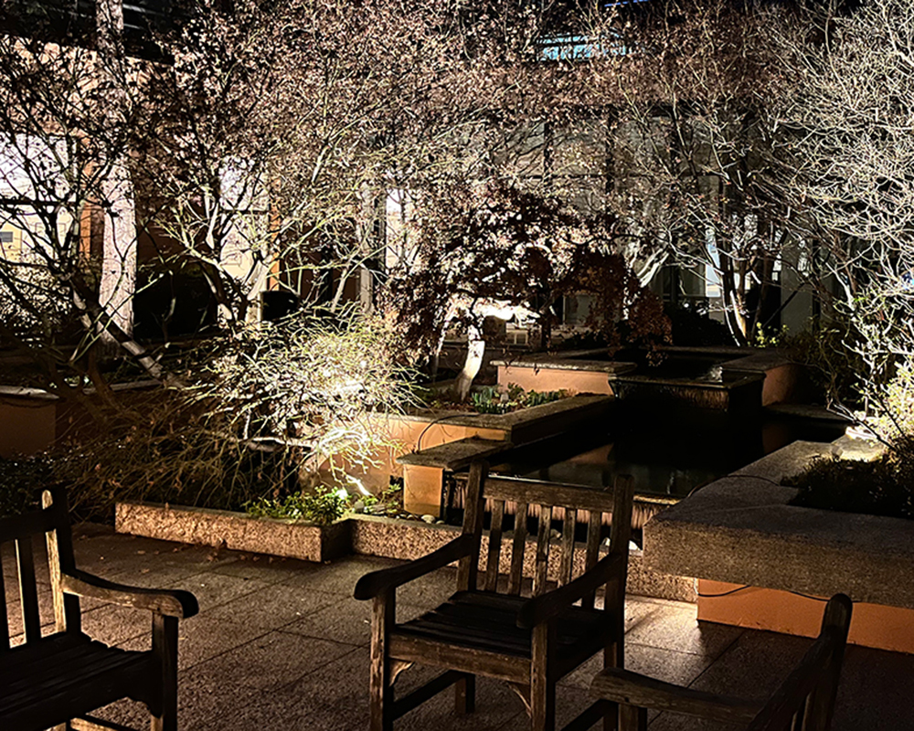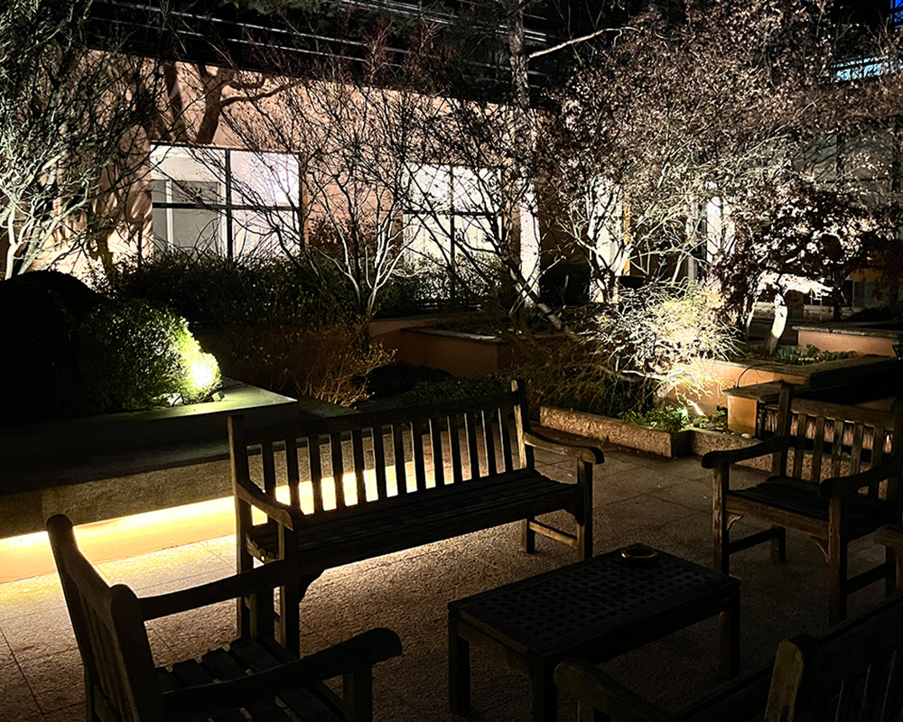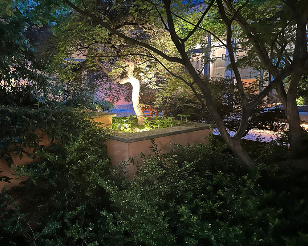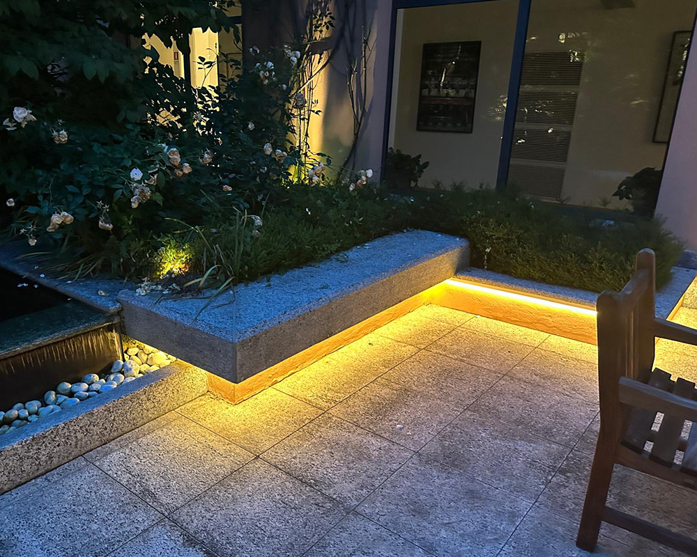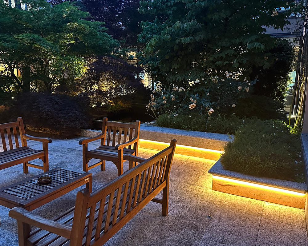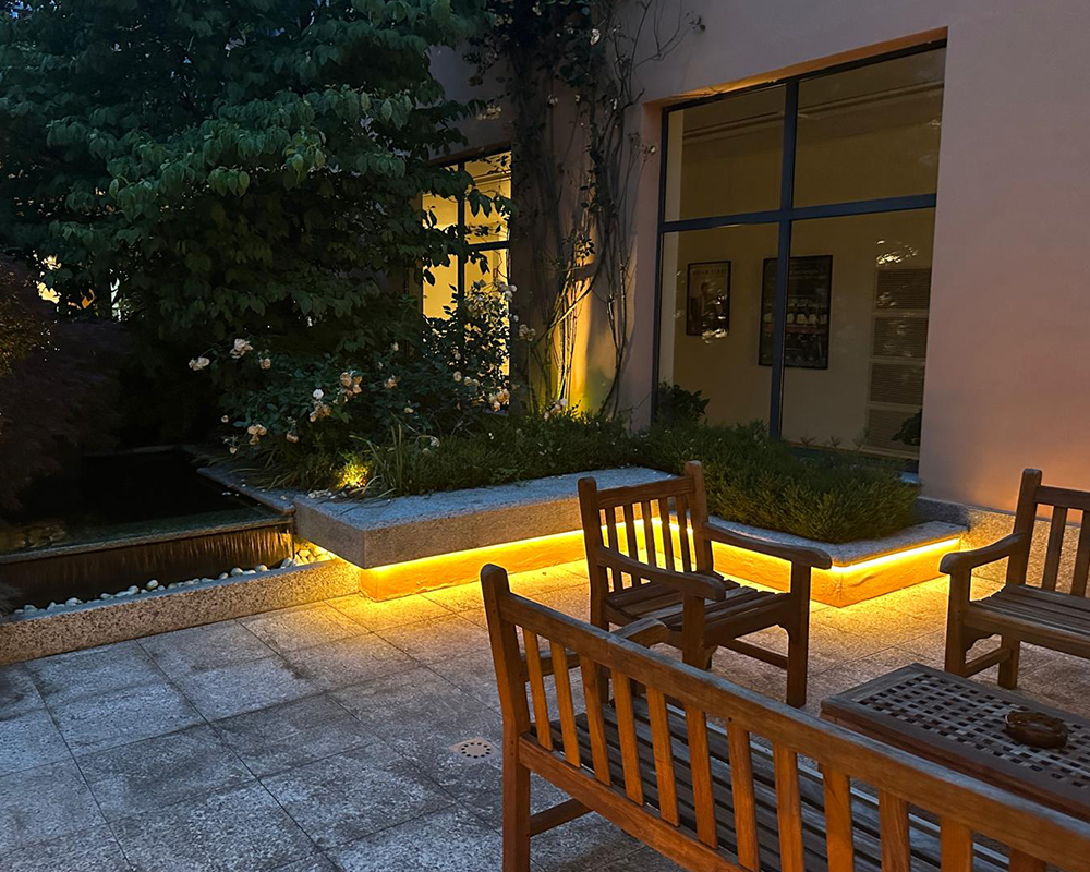 Un ruolo centrale è stato affidato alla luce d’accento, capace di creare giochi di chiaroscuro che valorizzano la texture delle piante, i materiali naturali e i volumi architettonici presenti nel giardino. Gli effetti luminosi contribuiscono a costruire un’atmosfera accogliente, rilassante e scenografica, senza alterare l’identità paesaggistica del luogo.