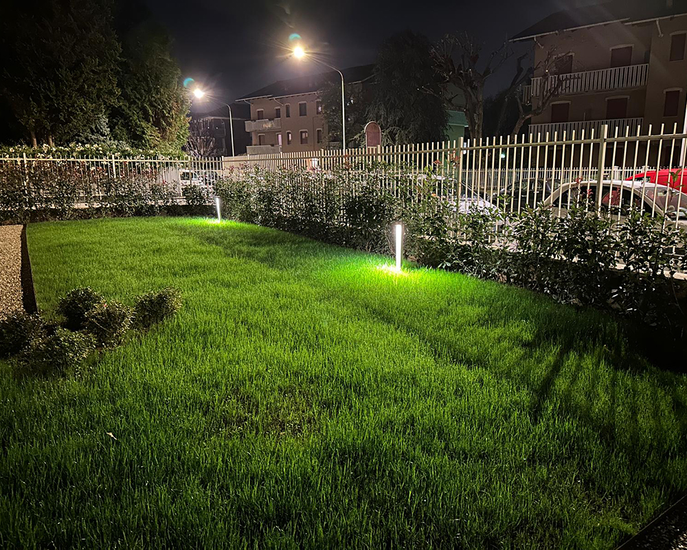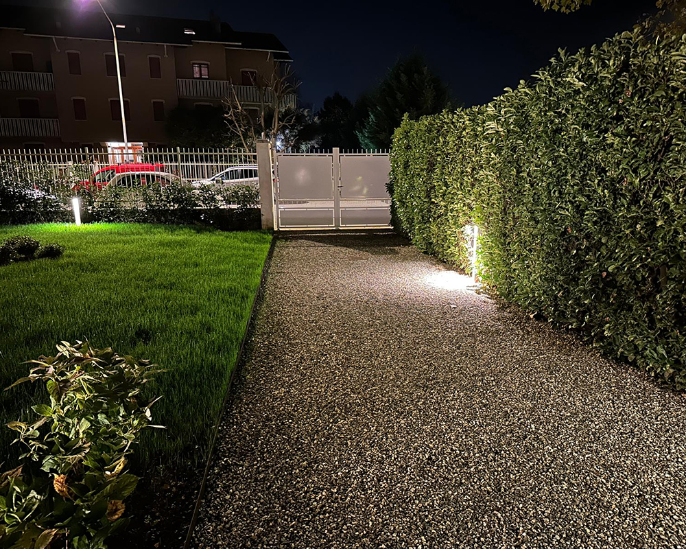 L’intervento ha previsto l’utilizzo di corpi illuminanti a LED a basso consumo energetico, selezionati per la loro resistenza agli agenti atmosferici e per un design discreto che si integra perfettamente con il verde circostante. L’illuminazione è stata progettata per evitare abbagliamenti e dispersioni, mantenendo un comfort visivo ottimale e rispettando l’equilibrio naturale dell’ambiente.
