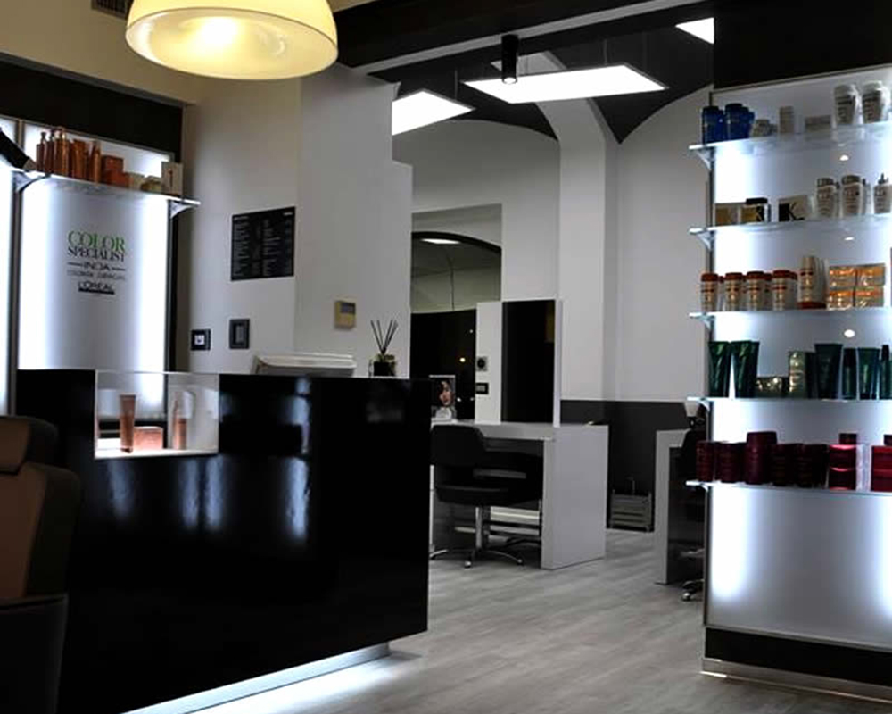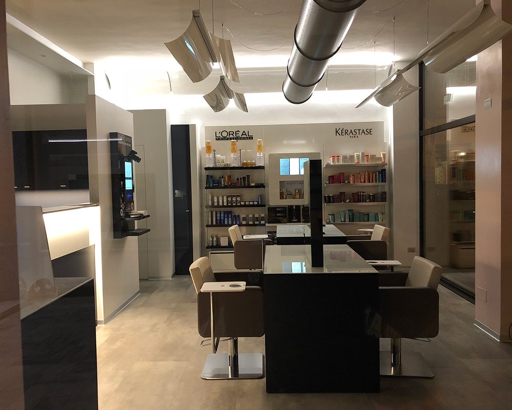 Sono state installate lampade customizzate studiate appositamente per l’attività, con una temperatura colore accuratamente selezionata per non alterare la percezione delle tonalità del capello. Questo aspetto era fondamentale per garantire una resa visiva reale e professionale sia nella fase di consulenza che nei trattamenti. Ogni punto luce è stato inoltre progettato per evitare abbagliamenti diretti ai clienti, migliorando il comfort e l’esperienza all’interno del salone.